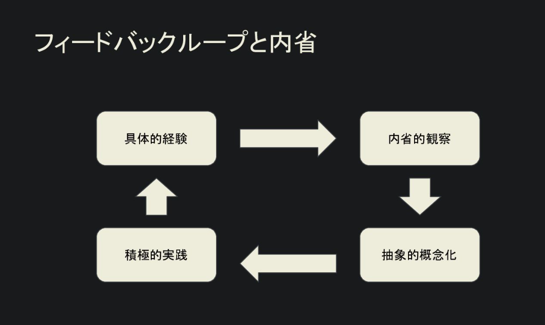 まず、兎にも角にもネクストアクションを設定することが重要である。 これはよく、1on1などでフィードバックすることでもあるが、コルブの経験学習モデルにおける具体的経験→内省的観測→抽象的概念化→能動的実験のサイクルを回すために必要なことはまず行動することであるからだ。